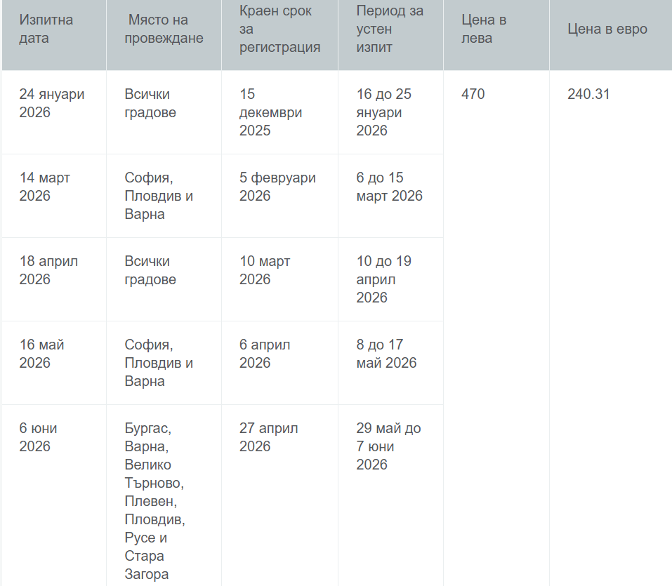 Оторизираните тест -центрове в България, където се провежда изпитът са в Британски съвет-София, Пловдив, Варна и Бургас. За повече информация, посетете официалния сайт на изпитa, където ще намерите конкретна информация за предстоящи дати и записване във всеки един от тези центрове. Таксата за явяване на изпит през 2026-та година е 255.14 евро.
